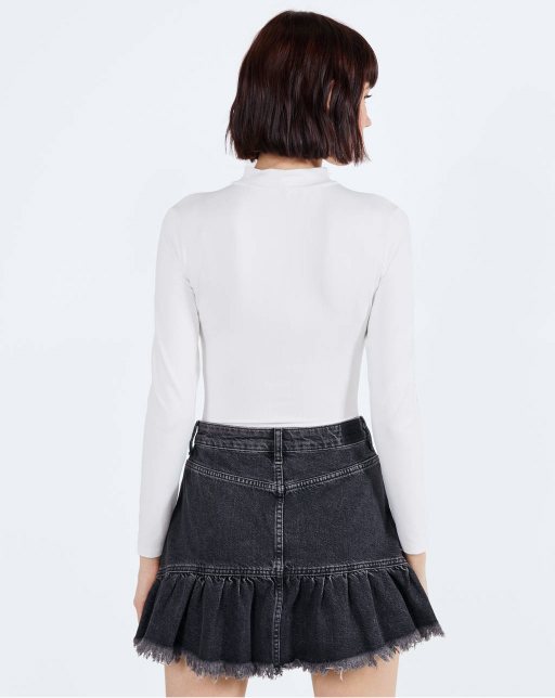The insulated jacket is made of leather. A light layer of insulation. Details: stand-up collar, zipper, two pockets on the sides.